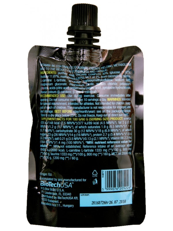 BioTech (USA) Energy Gel 1 Serving (60 грамм)l – энергетический гель для приема во время нагрузок на выносливость длительность более 60 минут. Подходит велосипедистам, бегунам, триатлонистам, биатлонистам и другим спортсменам-стайерам.