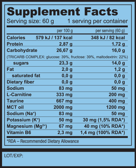 Энергетик содержит тройную углеводную матрицу triCARB®, масло MCT, ценные витамины и минералы. Формула быстро заряжает энергией, восстанавливает запасы гликогена, а затем поддерживает выносливость длительное время. Ее дополняют L-таурин и L-карнитин, повышающие выносливость и работу сердечно-сосудистой системы. Микроэлементы восстанавливают электролитный баланс.
