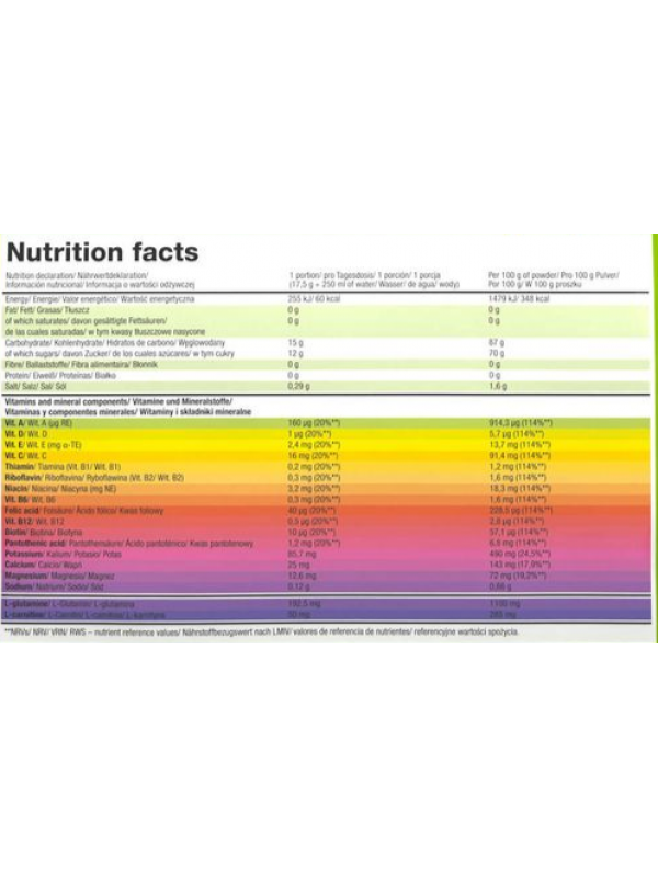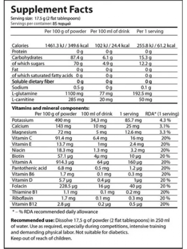 Порций в упаковке: 86 % DV (*) Суточное количество 7% 349.70 Ккал = 1461 КДж Энергетическая ценность Весь Жир 0% 0 g Углеводы % 87.4 g Протеин 0% 0 g Натрий ** 0,5. mg Кальций % 149 mg L-глютамин ** 1100 mg L-карнитин % 286 mcg Витамин В6 % 2.85 mcg Калий % 490 mg Магний % 27.75 mcg Витамин C % 91.60 mg Тиамин % 2,31 mg Рибофлавин % 2.3 mg Ниацин % 5.92 mg Витамин Е % 12.29 mg Фолиевая Кислота % 74 mcg Витамин B12 % 0.93 mcg Биотин % 182 mcg Пантотеновая Кислота % 7.32 mg Фолацин % 246 mg