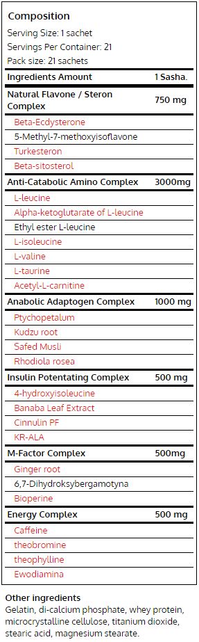 • Анаболическая матрица из экстрактов шафед мусли, радиолы розовой, муиры пурамы, пуэрарии кудзу. Вместе эти травы повышают выносливость, снижают катаболизм, предотвращают моральную усталость, поддерживают сексуальное здоровье. Эти факторы очень важны для хороших результатов в зале.