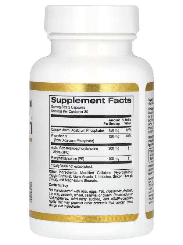 Добавка для здоровья мозга от California Gold Nutrition содержит альфа-глицерилфосфорилхолин AlphaSize, фосфатидилсерин SerinAid, фосфор и кальций в растительных капсулах. Продукт подходит для вегетарианцев и веганов и не содержит глютена и ГМО.