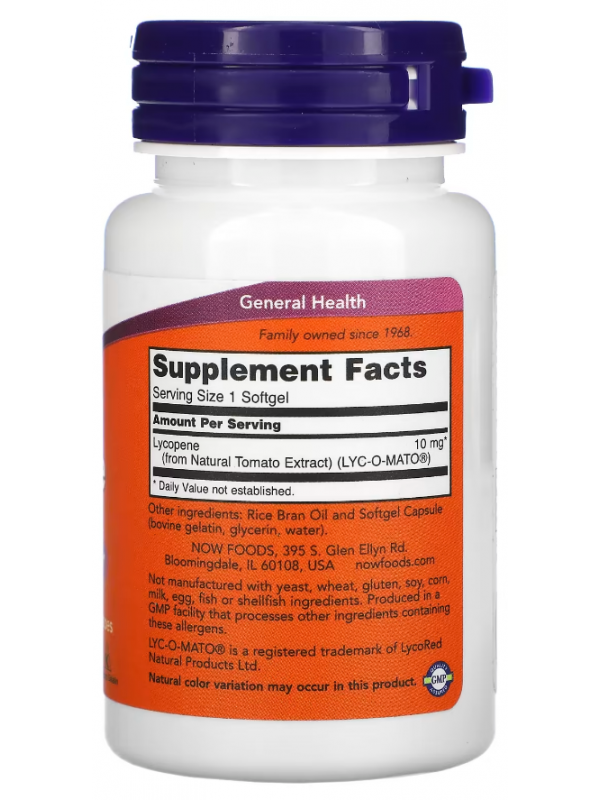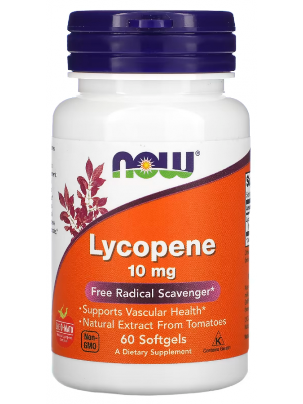 Ликопин NOW Lycopene 10 mg содержит запатентованный комплекс томатов Lyc-O-Mato с полным набором томатных фитонутриентов, включая натуральный ликопин. Натуральный ликопин известен своими способностями эффективно нейтрализовать свободные радикалы. Клинические исследования показывают, что ликопин помогает поддерживать здоровье сердечно-сосудистой системы и нормальную работу иммунной системы. Кроме того, ликопин может поддерживать здоровье простаты.