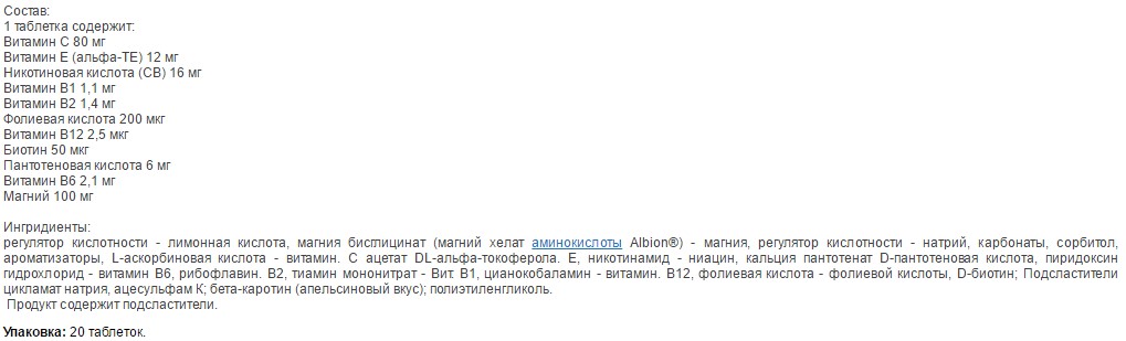 Другие ингредиенты: витамин В12, биотин, витамин В6, пантотеновая кислота, магний, лимонная кислота, цикламат натрия, ацесульфам калия, полиэтиленгликоль, подсластители.