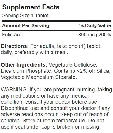 Состав Puritan's Pride Folic Acid 800 mcg на 1 таблетку: